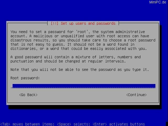 Now set your timezone and enter an root-passwort. Write down this password. It is the key for your whole system !