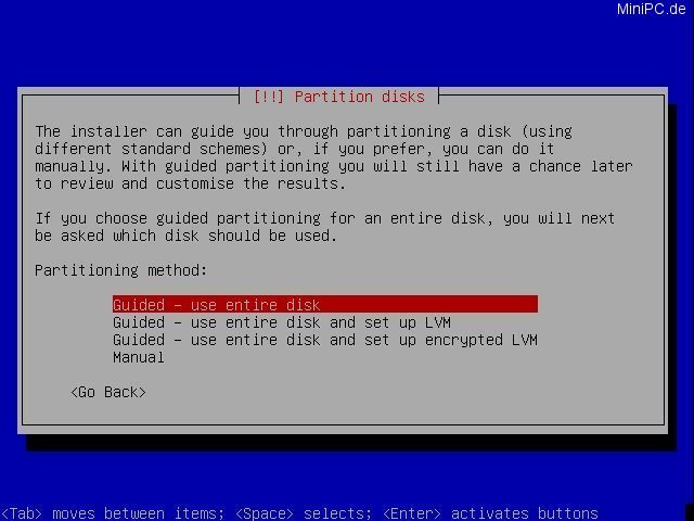 Now the system will partitionate the harddrive. Choose "Guided - use entire disk", and confirm the HDD in the next screen.