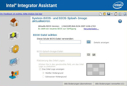 At point 1 of the upper picture you choose a BIOS file or download it directly from Intel. At point 2 you can choose a start logo which welcomes you at start-up of the system in future. The maximum size of the picture is 1024x768 pixels and can be used as JPG or BMP. At point 3 finally you can place the Intel Logo. As selection there are the four corners of the screen.